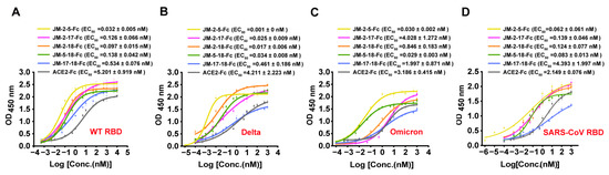 Binding characterization of identified VNARs and ACE2 to various RBD by ELISA. (A–D) VNAR-Fc fusions binding to RBD of WT (A), Delta (B), Omicron (C), and SARS-CoV (D) were characterized using ELISA. Error bars indicate means ± the SD from three independent experiments. The EC50 was calculated by fitting the OD450 values from serially diluted VNAR-Fc fusions or ACE2-Fc to a sigmoidal dose–response curve.