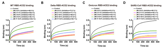 The blocking ability of bi-paratopic VNAR-Fc fusions against RBD-ACE2 interaction was further determined. JM-2-5-Fc, JM-2-17-Fc, and JM-2-18-Fc fusions exhibited similar activities in blocking ACE2 binding to the RBD of WT, Delta, Omicron, or SARS-CoV. The inhibition rates of these three bi-paratopic VNARs were ~50%, ~70%, ~60%, and ~80% for the RBD of SARS-CoV-2 WT, Delta, Omicron, and SARS-CoV, respectively (Figure 11). Importantly, bi-paratopic VNAR-Fc fusions acquired blocking activities against the interaction between Omicron RBD and ACE2 (Figure 11C).