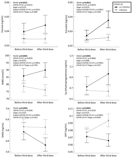 The plasma/serum levels of estrone, estradiol, SHBG (serum), 5α-dihydroprogesterone, DHEA and DHT in fertile women (n = 25) who were reactive (indicating a prior COVID-19 infection) and non-reactive (no infection) to anti-SARS-CoV-2 antibodies before and after the third dose of COVID-19 vaccination. The symbols (circles and triangles) with error bars represent retransformed means with 95% confidence intervals computed using the least significant difference multiple comparisons (p < 0.05). Confidence intervals that do not overlap denote significant differences between the respective subgroups of means. Statistical significances (p-values) are shown in each graph. Stage means status before or after third dose of vaccination. COVID-19 inf.*Stage represents the interaction between these variables.