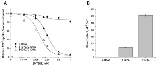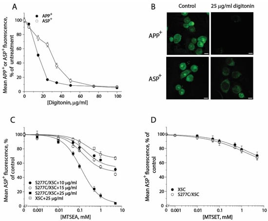 2.3. MTSET Modification of the Cysteine Residues in the Extracellular Pathway Inhibits APP+ Uptake