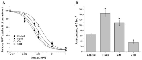 - Solis, E., Jr.; Zdravkovic, I.; Tomlinson, I.D.; Noskov, S.Y.; Rosenthal, S.J.; De Felice, L.J. 4-(4-(dimethylamino)phenyl)-1-methylpyridinium (APP+) is a fluorescent substrate for the human serotonin transporter. J. Biol. Chem. 2012, 287, 8852–8863. [Google Scholar] [CrossRef]