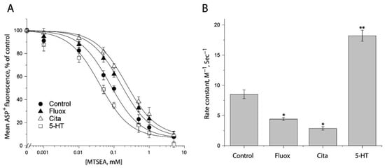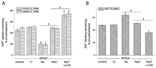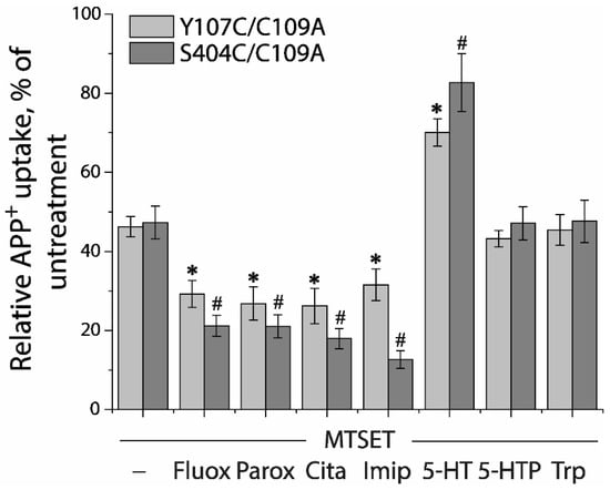- Keller, P.C., 2nd; Stephan, M.; Glomska, H.; Rudnick, G. Cysteine-scanning mutagenesis of the fifth external loop of serotonin transporter. Biochemistry 2004, 43, 8510–8516. [Google Scholar] [CrossRef]