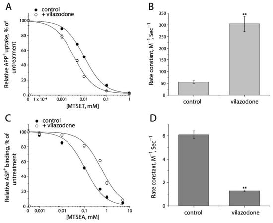 - Plenge, P.; Yang, D.; Salomon, K.; Laursen, L.; Kalenderoglou, I.E.; Newman, A.H.; Gouaux, E.; Coleman, J.A.; Loland, C.J. The antidepressant drug vilazodone is an allosteric inhibitor of the serotonin transporter. Nat. Commun. 2021, 12, 5063. [Google Scholar] [CrossRef]