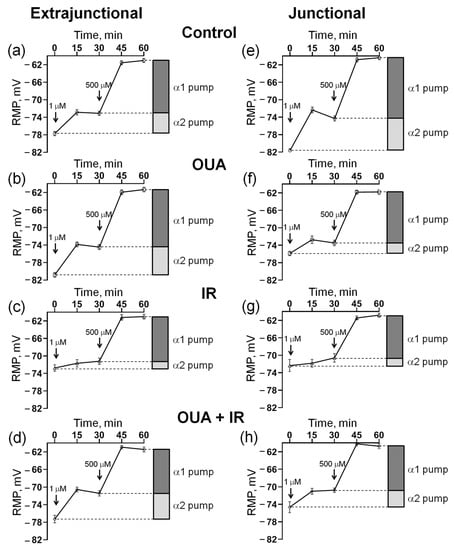 2.4. IR-Induced Loss in the Electrogenic Contribution of the α2 Na,K-ATPase and Sarcolemma Depolarization Was Not Seen after Chronic Ouabain