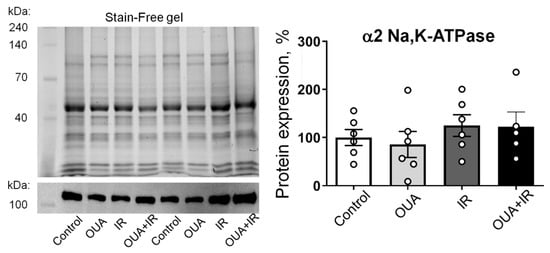 - Kravtsova, V.V.; Paramonova, I.I.; Vilchinskaya, N.A.; Tishkova, M.V.; Matchkov, V.V.; Shenkman, B.S.; Krivoi, I.I. Chronic Ouabain Prevents Na,K-ATPase Dysfunction and Targets AMPK and IL-6 in Disused Rat Soleus Muscle. Int. J. Mol. Sci. 2021, 22, 3920. [Google Scholar] [CrossRef]