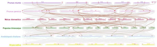 - Wang, Y.; Tang, H.; DeBarry, J.D.; Tan, X.; Li, J.; Wang, X.; Lee, T.-h.; Jin, H.; Marler, B.; Guo, H.; et al. MCScanX: A toolkit for detection and evolutionary analysis of gene synteny and collinearity. Nucleic Acids Res. 2012, 40, e49. [Google Scholar] [CrossRef]