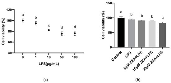 Cell viability was measured using the CCK-8 kit following the manufacturer’s instructions. When cells reached 70–80% confluency, they were treated with different concentrations of LPS (1, 10, 50, and 100 μg/mL) and ZEA (5, 15, and 30 μM) for 24 h. Then, the cell viability was detected, a total of 10 μL of CCK-8 reagent was added to each well, and the cells were incubated at 37 °C for 1.5 h. Then, cell viability was measured using a microplate reader. Cell viability was calculated from the absorbance value (OD) of each well, measured at 450 nm.