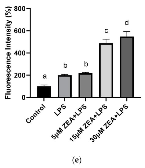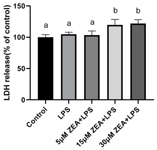 The results of lactate dehydrogenase (LDH) show that, compared with the control group, there is a significant difference between the 15 μM ZEA + LPS group and the 30 μM ZEA + LPS group (p < 0.05, Figure 2), and there is no difference with the 5 μM ZEA + LPS group. Compared with the LPS group, there is a significant difference between the 15 μM ZEA + LPS group and the 30 μM ZEA + LPS group (p < 0.05, Figure 2), but there is no difference with the 5 μM ZEA + LPS group. In conclusion, the 30 μM ZEA + LPS group has a greater effect on cell viability and LDH.