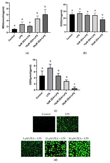 Combination of ZEA and LPS causes the oxidative stress response of MAC-T cells. (a–c) MDA, SOD, and GSH levels are detected after MAC-T cells were treated with 1 μg/mL LPS and 5, 15, and 30 μM ZEA for 24 h. (d) Untreated control or LPS and ZEA-treated MAC-T cells were stained with DCFH-DA probe. (e) Fluorescence intensity data based on the images in Figure 3d. Each experiment was repeated 3 times. All values are expressed as mean ± SD (n = 3). Different letters a, b, c, and d indicate p < 0.05. Scale bar = 200 μm.