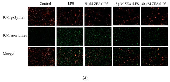 Next, we measured changes in mitochondrial membrane potential (MMP) in MAC-T cells under different treatments using the JC-1 fluorescent probe. The results of this study show that, compared with the control group, MMP is significantly decreased in the LPS group (p < 0.05, Figure 4), and the combined treatment of ZEA and LPS is also significantly decreased (p < 0.05, Figure 4). Compared with the LPS group, the 5 μM ZEA + LPS group is significantly decreased (p < 0.05, Figure 4), and the 15 and 30 μM ZEA + LPS groups are not. This indicates that the combination of LPS and ZEA has a significant effect on mitochondrial damage.