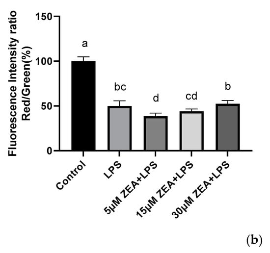 The combination of ZEA and LPS reduces the mitochondrial membrane potential of MAC-T cells. (a) Changes in mitochondrial membrane potential after treatment of MAC-T cells with LPS and ZEA for 24 h. (b) Plotted from the ratio of fluorescence intensities in Figure 4a. Each experiment was repeated 3 times. All values are expressed as mean ± SD (n = 3). Different letters a, b, c, and d indicate p < 0.05. Scale bar = 200 μm.