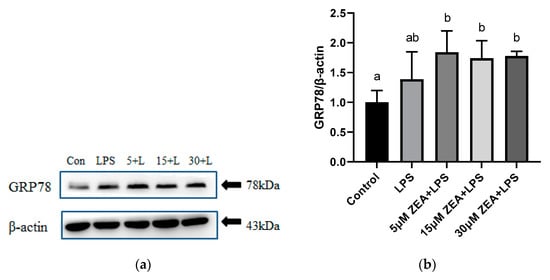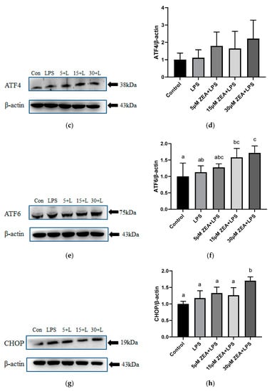 As shown in Figure 5a,b, glucose-regulated protein 78 kDa (GRP78) protein levels are increased in the 5 μM ZEA + LPS group, 15 μM ZEA + LPS group, and 30 μM ZEA + LPS group, compared with the control group (p < 0.05). Compared with the control group, the activating transcription factor 4(ATF4) protein levels of the other four groups are not significantly different(Figure 5c,d). Compared with the control group, the activating transcription factor 6(ATF6) protein level is increased in the 15 μM ZEA + LPS group and the 30 μM ZEA + LPS group (p < 0.05, Figure 5e,f). Compared with the LPS group, the ATF6 protein level is significantly increased in the 30 μM ZEA + LPS group (p < 0.05, Figure 5e,f). In the detection of C/EBP homologous protein (CHOP), compared with the control group, the level of CHOP protein in the 30 μM ZEA + LPS group is increased (p < 0.05, Figure 5g,h). Compared with the LPS group, the CHOP protein level in the 30 μM ZEA + LPS group is increased (p < 0.05, Figure 5g,h).