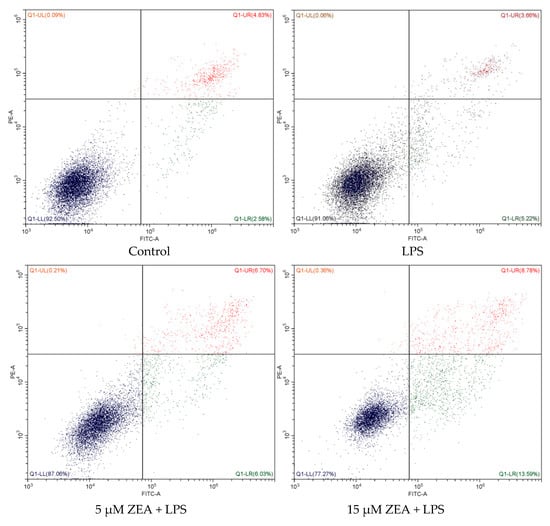 The pro-apoptotic effect of LPS is demonstrated in Caco-2 human intestinal epithelial cells and bovine glomerular endothelial cells [,]. The bovine mammary epithelial cells treated with 100 ng/mL LPS are found to reduce cell viability, attenuate the expression of Bcl-2 mRNA, and significantly increase the expression of Bax mRNA []. The effects of LPS and ZEA on the apoptosis of MAC-T cells are determined. In terms of protein levels, the 15 uM ZEA + LPS group and the 30 μM ZEA + LPS group increase Bax protein levels and decrease Bcl-2 protein levels compared with the LPS alone group. In terms of Bax/Bcl-2 ratio, the 15 μM ZEA+LPS group and the 30 μM ZEA + LPS group are significantly increased compared with the LPS group. The results of flow cytometry to detect the apoptosis rate also show that the combination of ZEA and LPS treatment of MAC-T cells, compared with the LPS group treatment, increases the apoptosis rate. In our previous study, the results show that 30 μM ZEA treatment of MAC-T cells for 24 h induces apoptosis [].