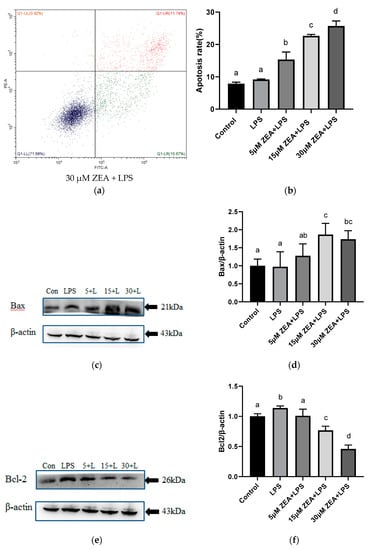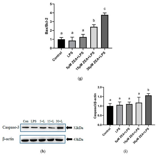 Meantime, this study examined the effects of ZEA and LPS on the apoptosis of MAC-T cells. As shown in Figure 6a,b, the results of flow cytometry to detect cell apoptosis show that, compared with the control group, there are no significant differences in the LPS group, but with the increase in ZEA concentration, the combination of ZEA and LPS-treated cell apoptosis rate increases significantly. As shown in Figure 6c,d, compared with the control group, the Bax protein level is significantly increased in the 15 μM ZEA + LPS group and the 30 μM ZEA + LPS group (p < 0.05). Compared with LPS, Bax protein levels are significantly increased in 15 μM ZEA + LPS group and 30 μM ZEA + LPS group (p < 0.05). In Figure 6e,f, compared with the control group, the Bcl-2 protein level in the LPS group is significantly increased (p < 0.05), and the Bcl-2 protein level in the 15 μM ZEA + LPS group and the 30 μM ZEA + LPS group is significantly decreased (p < 0.05). Compared with the LPS group, the concentration of ZEA decreases significantly (p < 0.05). As shown in Figure 6g, compared with the control group, the Bax/Bcl-2 ratio in the 15 μM ZEA + LPS group and the 30 μM ZEA + LPS group is increased (p < 0.05). Compared with the LPS group, the Bax/Bcl-2 ratio of the 15 μM ZEA + LPS group and the 30 μM ZEA + LPS group increases (p < 0.05). As shown in Figure 6h,i, compared with the control group, the caspase-3 protein level in the 30 μM ZEA + LPS group is significantly increased (p < 0.05). Compared with LPS, the protein level of caspase-3 in the 30 μM ZEA + LPS group is significantly increased (p < 0.05).