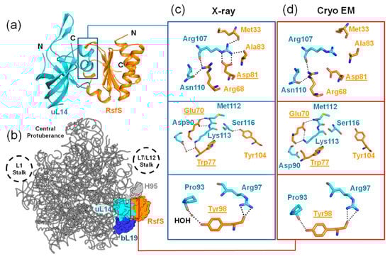 The interaction of RsfS with uL14 and the 50S ribosomal subunit from S. aureus. (a) The crystal structure of the RsfS–uL14 heterodimer (PDB: 6SJ5). (b) The cryo-EM structure of the 50S–RsfS complex from S. aureus (PDB: 6SJ5). (c,d) The contacting amino acid residues at the interface between uL14 and RsfS from X-ray and cryo-EM structures, respectively. Potential H-bonds are represented by dashed lines. Water molecules (HOH) are represented by red spheres. The chosen amino acid residues for replacement are underlined.