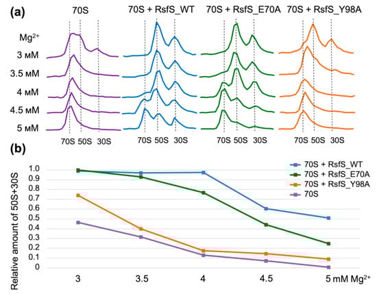 We chose four amino acids on the RsfS surface that form contacts with uL14 (E70, D81, W77, and Y98) and that are supposedly important for the formation of the RsfS–50S complex (Figure 1c,d). To verify our assumption, we performed single substitutions of the chosen amino acid residues for Ala. Only two mutations, E70A and Y98, provided soluble recombinant RsfS proteins. We added the 2X molar excess of purified RsfS proteins to vacant 70S ribosomes because such a concentration of proteins is optimal for sucrose gradient profile analysis []. Since RsfS has an anti-association effect on ribosomal subunits, and the association of bacterial ribosomal subunits is most sensitive to the concentration of magnesium ions (Mg2+) [], we decided to titrate Mg2+ at a constant concentration of monovalent salts to test the effect of RsfS mutations on the relative proportions of the free 50S subunits and 70S ribosomes (Figure 2a).
