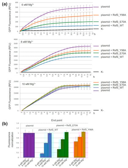 The influence of RsfS amino acid replacements on GFP cell-free translation with a variable Mg2+ concentration. (a) Kinetics experiments of GFP fluorescence in a cell-free in vitro translation assay. (b) Endpoint GFP fluorescence. «K-», cell-free system mix without the addition of a reporter plasmid (black); «plasmid», cell-free system mix with the addition of a reporter plasmid (violet); «plasmid + RsfS_WT», cell-free system mix with the addition of a reporter plasmid and the wild-type RsfS (blue); «plasmid + RsfS_E70A», cell-free system mix with the addition of a reporter plasmid and the mutant RsfS_E70A (green); «plasmid + RsfS_Y98A», cell-free system mix with the addition of a reporter plasmid and the mutant RsfS_Y98A (orange). Error bars indicate the standard deviation (n = 3).