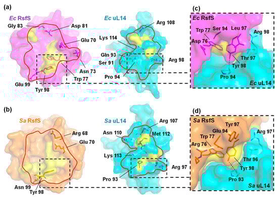 The interaction interfaces of the RsfS–uL14 heterodimer in the cryo-EM complex: (a) E. coli (PDB: 7BL4); (b) S. aureus (PDB: 6SJ6). The interaction surfaces between RsfS and uL14 are represented by the red border. Hydrophobic regions are shown as yellow surfaces and contacting H-bond-forming amino acids are shown as sticks. The heterodimer contacting surfaces around Y98 of RsfS from E. coli (c) and S. aureus (d) are shown in the zoomed boxes. H-bonds are represented by black dashed lines; the water molecule is represented by a red ball.