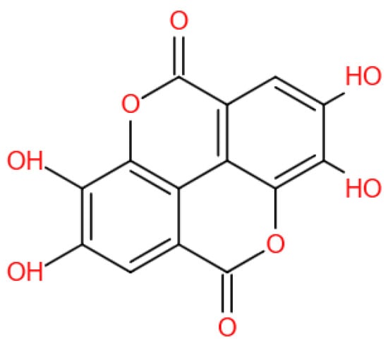 EA (Figure 1) is a chromene-dione derivative (C14H6O8) []. There are four hydroxyl groups, two lactones, and two hydrocarbon rings which give EA the ability to accept electrons from different substrates and participate in antioxidant reactions []. It exists in the natural environment in free form, and, more often than not, in condensed form, for example, as ellagitannins (ETs), glycosides, and so on. EA is widely present in some fruits, nuts, and seeds, for instance, pomegranates, black raspberries, raspberries, strawberries, walnuts, and almonds []. Several studies have revealed that EA possesses potent biochemical and biological activities, including antioxidative, anti-inflammatory, and neuroprotective effects.