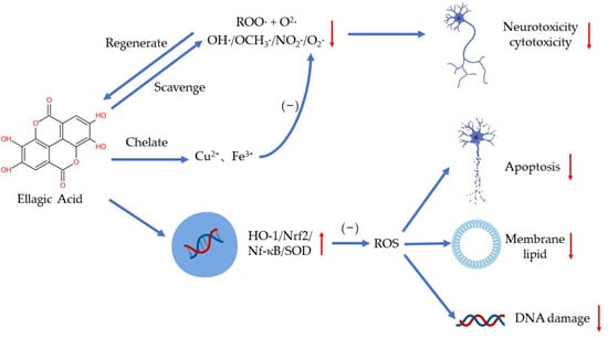 Oxidative imbalance plays an important role in the pathogenesis of AD. The sources of free radicals in AD can be summarized in three aspects: (1) the accumulation of Fe and Al in neurons containing NFT can lead to the formation of OH·; (2) activated microglia that can form NO and ·; and (3), the abnormal metabolism of mitochondria can produce ROS []. It has been found that Fe, Zn, and Cu can bind to Aβ and APP and increase the oxidative stress of the AD brain []. Another pathologic feature of AD is the hyperphosphorylation of τ proteins, where the phosphorylation process is associated with the activation and oxidation of Nf-κB; this is important because the τ protein may be related to oxidative stress []. It has been clarified that EA can reduce the death of cells containing Aβ, lower the production of ROS, and mitigate DNA damage []. With its powerful free radical scavenging ability, EA can inhibit lipid peroxidation and reduce the production of NO, glycation end products, and so on [].