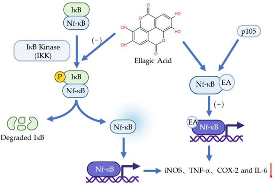 The nf-κB pathway plays a vital role in inflammation, immune response, and apoptosis. The activation of Nf-κB is caused by extracellular stimuli, for example, cytokines, radiation, heavy metals, and viruses []. Normally, IκB presents in the cytoplasm and binds to Nf-κB through the specific ankyrin repeat-containing domain at IκB’s C terminal to inhibit the transfer of Nf-κB. When the pathway is activated, IκB will be phosphorylated by IκB Kinase (IKK) so Nf-κB will be free to transfer to the nucleus to regulate genes involved in inflammation []. It has been found that EA can bond with one of the precursor proteins (p50) of Nf-κB, p105. This bonding obstructs the binding of Nf-κB to a specific DNA domain so the genes regulated by Nf-κB would not be expressed []. Another function of EA on Nf-κB is inhibiting the phosphorylation of IkB and the subsequent translocation of NF-kB into the nucleus []. Numerous pieces of evidence have shown that EA can inhibit the Nf-κB pathway and downregulate the expression of iNOS, TNF-α, COX-2, and IL-6 [,,] (Figure 3).