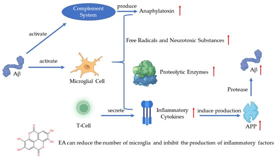 In recent years, much evidence has proven that inflammation plays an important role in AD pathogenesis with the pathological observations of the inflammatory process []. As one of the pathogenetic features of AD, Aβ has been proven to activate the complement system and microglia []. Microglia are the immune cells in the CNS and the activation of microglia leads to the secretion of inflammatory cytokines, anaphylatoxin, free radicals, and neurotoxic substances which can kill neurons [,,]. A recent study has shown that the activated microglia can synthesize proteolytic enzymes which can destroy cell structures and lead to the dysfunction of neurons []. The T-cells can also be activated in such a process and release inflammatory cytokines such as IL-1α, IL-1β, and TNF-α []. The excessive release of inflammatory cytokines induces the production of APP, which will positively upregulate the production of Aβ []. The continuous activation of pro-inflammatory responses could cause damage to the brain and the worsening of AD []. A study revealed that EA can regulate the production of IL-1β and TNF-1α to protect the damaged neurons induced by arsenic and improve the behavior and pathological change of AD []. Another key finding indicates that EA can reduce the number of microglia and inhibit the production of inflammatory cytokines [] (Figure 4).