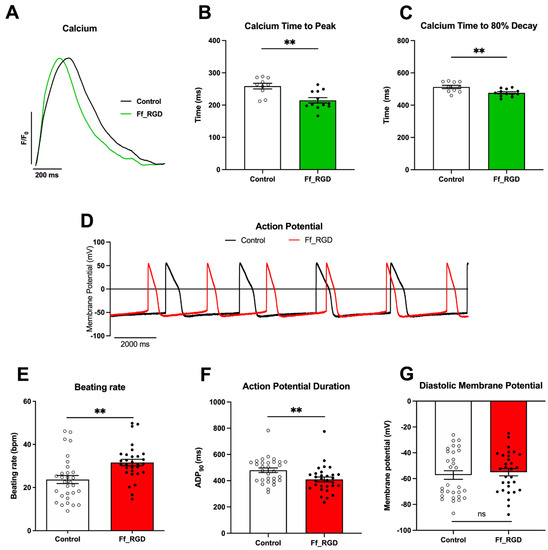 Fibril−forming integrin ligands module cardiomyocyte Ca2+ transients and action potential morphology. (A) Ca2+ transient representative traces after 24 h treatment with ff_RGD (2 mM) (green) compared to control (black) during 1 Hz field−stimulation. Ca2+ transient (B) TTP (** p = 0.0016) and (C) T80 illustrated as means ± SEM (** p = 0.0055) (n = 10 control, n = 12 ff_RGD images from four batches). (D) AP representative traces of spontaneously beating ff_RGD−treated cardiomyocytes (red) compared to control (black). Parameters measured were (E) beating rate (** p = 0.0018), (F) AP duration (** p = 0.0029), and (G) maximum diastolic membrane potential (ns p = 0.602) illustrated as means ± SEM (n = 30 control, n = 30 ff_RGD cells from 10 dishes, duplicates from five batches). hiPSC−CMs were used at day 40–46 of differentiation.