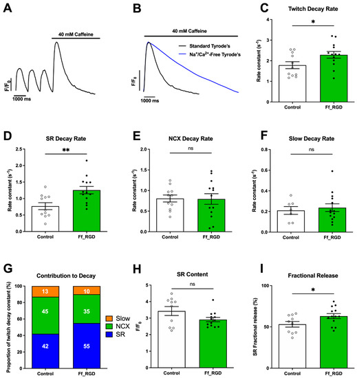 The ability of ff_RGD to abbreviate Ca2+ transients in hiPSC-CM monolayers without changing the cell density afforded us the ability to assess the contributions of Ca2+ transporters to Ca2+ extrusion [15]. Locally applied caffeine induced an increase in cytoplasmic Ca2+ in both the standard and Na+/Ca2+-free Tyrode’s solution (Figure 2A,B). In keeping with a reduced T80 (Figure 1C), ff_RGD increased Ca2+ transient decay rate (Figure 2C; p = 0.0446), attributed to a 63% increase in SR Ca2+ uptake rate (Figure 2D; p = 0.0049). Ff_RGD had no effect on Na+−Ca2+ exchanger (NCX) (Figure 2E; p = 0.941) or the slow Ca2+ removal mechanisms (Figure 2F; p = 0.856). The SR:NCX ratio is an important indicator of Ca2+ cycling maturity [16]. The SR:NCX ratio changed from 49:51 in control to 62:38 with ff_RGD (Figure 2G). Ff_RGD did not change the SR content (Figure 2H; p = 0.376) but increased SR fractional release (Figure 2I; p = 0.0426). These results demonstrate that ff_RGD increases SR contribution to Ca2+-induced Ca2+ release (CICR) and Ca2+ removal required for cessation of contractile activity.