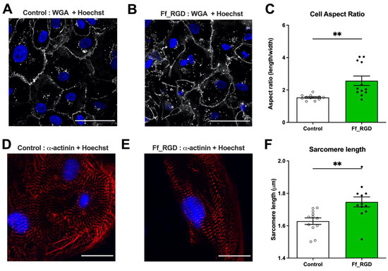 Following 24 h treatment with ff_RGD, we observed key changes in hiPSC-CM morphology (Figure 3A,B). Notably, we identified an increase in cell aspect ratio (Figure 3C; p = 0.0021), closer to that of the adult human CM. By labelling α-actinin (Figure 3D,E), we identified an increase in sarcomere length following ff_RGD treatment vs. control (Figure 3F; 1.75 ± 0.0309 μm vs. 1.63 ± 0.0201 μm, p = 0.0039), a key determinant of contractile activity. Other key changes include a reduction in hiPSC-CM cross-sectional area and volume (Supplementary Figure S2C,D). Adult human CMs are significantly larger than hiPSC-CMs. Rather than acting in isolation, further biochemical or mechanical stimuli beyond integrin ligand–receptor activity are likely to drive the increase in cell area and volume in the developing CM.
