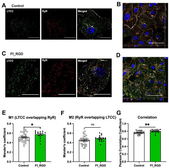 SR Ca2+ release occurs at the junction between the SR domains closest to the sarcolemma (junctional SR (jSR)) that bears the Ca2+ release channels (ryanodine receptor (RyR2)) and the sarcolemmal L-type voltage-gated Ca2+ channels (LTCCs). Following immunofluorescence labelling of the 1.2α subunit of LTCCs and RyR2 in control (Figure 4A,B) and ff_RGD-treated (Figure 4C,D) monolayers, Mander’s coefficient of LTCCs overlapped with the background of RyR pixels (M1) increased following ff_RGD treatment (Figure 4E; p = 0.0363). There was no difference in the Mander’s coefficient of RyR2 overlapped with a background of LTCC pixels (M2) (Figure 4F; p = 0.1143). Pearson’s correlation coefficient between LTCC and RyR2 increased following ff_RGD treatment (Figure 4G; p = 0.001). These findings indicate that integrin ligand–receptor interactions mediate co-localisation of RyR2 with sarcolemmal LTCCs responsible for CICR, in keeping with abbreviation in Ca2+ transient TTP (Figure 1B).