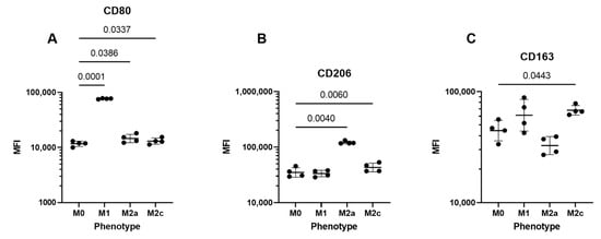 Flow cytometry measures of MDM surface markers. MDMs were polarized into M0, M1, M2a and M2c. Cells were harvested and the surface markers CD80 (A), CD206 (B) and CD163 (C) were measured with flow cytometry. The numbers above the horizontal lines indicate the different p-values.