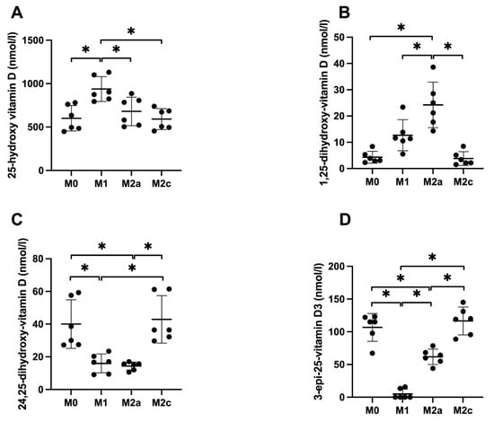 Vitamin D metabolites in polarized MDMs after vitamin D stimulation. MDMs were polarized into M0, M1, M2a and M2c MDMs and stimulated with 1000 nM 25-hydroxy-vitamin D. Concentrations of vitamin D metabolites in the different subtypes of MDMs were measured in the media after 24 h: 25-hydroxy-vitamin D (A), 1,25-dihydroxy-vitamin D (B), 24,25-dihydroxy-vitamin D (C) and 3-epi-25-hydroxy-vitamin D (D). * Indicates statistically significant differences between groups (subtypes) on each graph.