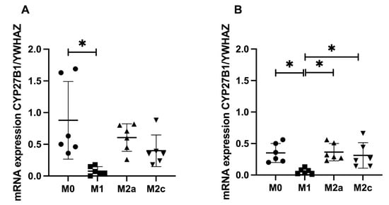 Expression of CYP27B1 in polarized MDMs with and without vitamin D stimulation. MDMs were polarized into M0, M1, M2a and M2c MDMs and stimulated with either 0 nM (A) or 1000 nM (B) 25-hydroxy-vitamin D for 24 h. The mRNA expression of CYP27B1 is shown relative to the household gene (YWHAZ). * Indicates a statistically significant difference between groups.
