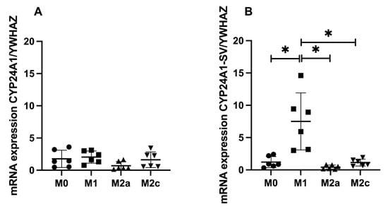 Expression of CYP24A1 and CYP24A1-SV in polarized MDMs after vitamin D stimulation. MDMs were polarized into M0, M1, M2a and M2c MDMs and stimulated with 1000 nM 25-hydroxy-vitamin D for 24 h. The mRNA expression of CYP24A1 is shown in (A) and the mRNA expression of its splice variant, CYP24A1, is shown in (B). Both expressions are shown relative to a household gene (YWHAZ). * Indicates a statistically significant difference between groups.