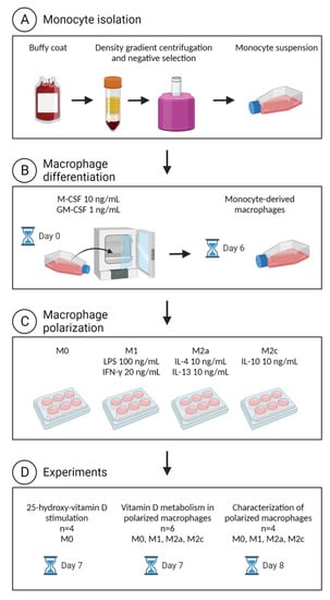 We obtained buffy coats (about 50 mL) from 10 anonymous donors provided by the Department of Clinical Immunology, Aarhus University Hospital, Denmark (Project no. 0094). According to Danish law, the use of anonymized buffy coats does not require specific ethical approval. Monocytes from four donors (D1–D4) were polarized into undifferentiated (M0) MDMs, with the main focus to investigate if 3-epi-25-hydroxy-vitamin D could be detected after stimulation with 25-hydroxy-vitamin D. Monocytes from another six donors (D5–D10) were polarized into M0, M1, M2a and M2c MDMs for the purpose of observing the pattern of vitamin D metabolism in different macrophage subtypes. Figure 5 shows an overview of the cell isolation and polarization protocol.