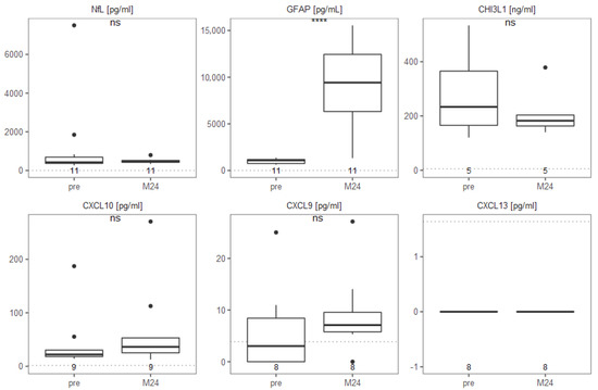 GFAP is increased in CSF after aHSCT while other MS biomarkers appear unchanged. Biomarker levels in the CSF pre- and 24 months post-aHSCT in MS patients. Concentrations in pg/mL of NfL, GFAP, CXCL9, CXCL10 and CXCL13 and in ng/ml of CHI3L1 are shown. Detection limits are visualized with a dotted line, number of patients are indicated below each boxplot. Wilcoxon test was used to detect significance, **** for p ≤ 0.0001.