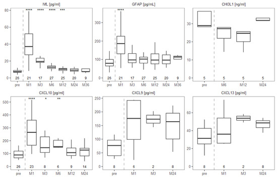 Serum levels of NfL, GFAP and CXCL10 transiently increase after aHSCT and then trend back to pre-aHSCT levels. Levels of studied biomarkers in the serum before and at several time points after aHSCT in MS patients. Concentrations in pg/mL are shown for NfL, GFAP, CXCL10, CXCL9 and CXCL13. Concentrations for CHI3L1 are shown in ng/ml. Numbers at the bottom indicate number of samples included in respective boxplot. Global Kruskal-Wallis test was used first and in case of a significant dif-ference, then a paired Wilcoxon signed-rank test as a post-hoc test with the pre-aHSCT time point as reference group. Significance levels were * for p ≤ 0.05, ** for p ≤ 0.01, *** for p ≤ 0.001 and **** for p ≤ 0.0001.