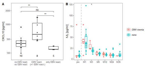 Patients suffering from a CMV viremia post-aHSCT present with higher serum CXCL10 one month post-aHSCT and higher serum NfL three months post-aHSCT. (A) CXCL10 in pg/mL in the serum one month after aHSCT in MS patients distinguished by viral reactivation of CMV (of CMV exclusively (n = 4) or simultaneously of CMV and EBV (n = 4)) vs. viral reactivation of only EBV (n = 5) vs. no CMV nor EBV reactivation (n = 10). (B) NfL in pg/mL in the serum at several time points after aHSCT differentiating between patients with and without CMV reactivation. In (A), a global Kruskal-Wallis test was used fist. To find differences between groups, an unpaired Wilcoxon signed-rank test was performed with * for p ≤ 0.05, and ** for p ≤ 0.01.
