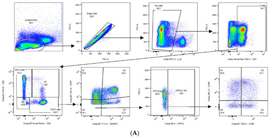 In brief, PBMCs were thawed, counted and 1 million cells analyzed. First, they were stained in PBS with a viability marker fixable green (Invitrogen Thermo Fisher Scientific, Waltham, MA, USA) while blocking with 40 μg/mL of human purified IgG (Merck, Sigma Aldrich, Schaffhausen, CH). Next, PBMCs were stained in FACS buffer (PBS containing 1% FCS and 2 mM EDTA) with the following surface markers: CD3 in AF700 (BD), CD4 in PE-Texas Red (Invitrogen), CD8 in BV510, CD45RA in BV711, CCR7 in BV421, CCR6 in BV785, CCR4 in APC, CRTh2 in PE (all BioLegend, San Diego, CA, USA). Samples were acquired with a BD LSR Fortessa (BD, Franklin Lakes, NJ, USA) and data analyzed using the software FlowJo (FlowJo Ashland, OR, USA).