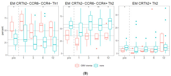 Effector-memory (EM) T cells show a higher Th1 and lower Th2 phenotype in patients with CMV viremia after aHSCT. PBMCs were stained with fluorophore-conjugated antibodies and analyzed by flow cytometry. In (A) the gating strategy is depicted in one representative example. (B) Th1 and Th2 phenotypes of EM CD4+ T cells before and at 1, 3, 6, and 12 months after aHSCT. For CMV viremia group, n = 5, 5, 4, 5, 4, for no CMV viremia group, n = 21, 16, 15, 22, 21. To detect significant differences, an unpaired Wilcoxon signed-rank test was used, significance levels were * for p ≤ 0.05, and ** for p ≤ 0.01.