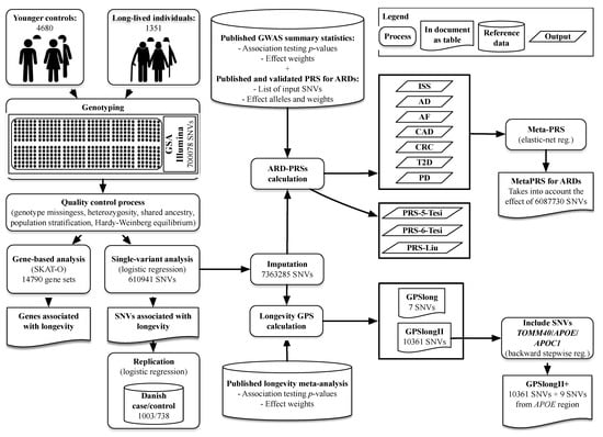Study design and workflow of the longevity case–control GWAS, calculation of ARD-PRSs, meta-PRS for the diseases and the GPS for longevity. AD, Alzheimer´s disease; AF, atrial fibrillation; ARD, age-related disease; CAD, coronary artery disease; CRC, colorectal cancer; ISS, ischemic stroke; GPS, genome-wide polygenic score; GWAS, genome-wide association study; PD, Parkinson´s disease; PRS, polygenic risk score; SNV, single nucleotide variant; T2D, type 2 diabetes mellitus.