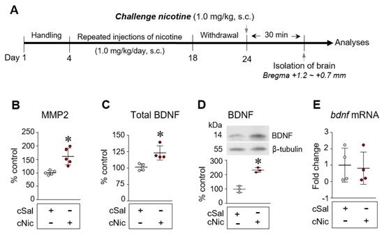 Challenge nicotine increases in MMP 2 activity (B) as well as pro- and mature BDNF (total BDNF) (C) and BDNF (D), but not bdnf mRNA (E), expression in the CPu of rats. Timeline (A). cSal, challenge saline; cNic, challenge nicotine. s.c., subcutaneous injection. n = 3–5 per group. * p < 0.05 vs. challenge saline group.