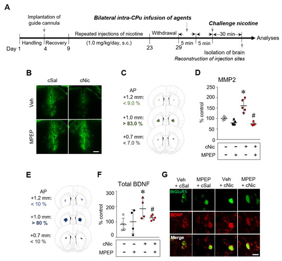 Blockade of mGluR5 decreases the challenge nicotine-induced increases in MMP 2 activity (D) and BDNF expression (F,G) in the CPu. Timeline (A). Pretreatment of MPEP does not reduce the challenge nicotine-induced FITC-conjugated fluorescence intensity when compared to the challenge nicotine group (B). Reconstruction of the bilateral intra-CPu injection of MPEP prior to challenge nicotine (C,E). Pretreatment of MPEP decreases the challenge nicotine-induced increase in mGluR5/BDNF-double positive cells in the CPu (n = 18–20 slides of 3–4 rats) (G). n = 4–5 per group. * p < 0.05 vs. challenge saline group or challenge saline + vehicle group; # p < 0.05 vs. challenge nicotine + vehicle group.