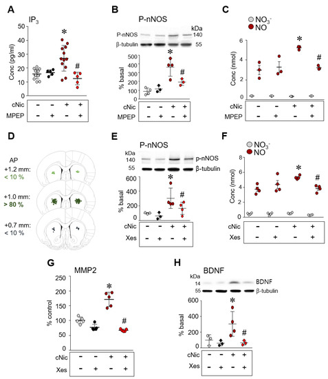 Blockade of mGluR5 and IP3 decreases the challenge nicotine-induced increases in IP3 (A), p-nNOS (B,E), NO (C,F), MMP2 activity (G), and BDNF (H) in the CPu. Reconstruction of the bilateral intra-CPu infusion of xestospongin C (Xes) prior to challenge nicotine (D). n = 3–12 per group. * p < 0.05 vs. challenge saline + vehicle group; # p < 0.05 vs. challenge nicotine + vehicle group.