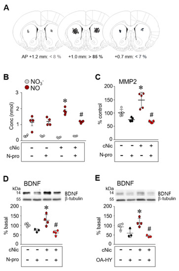 Inhibition of either nNOS or MMP2 decreases the challenge nicotine-induced increases in NO (B), MMP2 activity (C), and BDNF (D,E) in the CPu. Reconstruction of the bilateral intra-CPu infusion of Nω-propyl (N-pro) or OA-HY prior to challenge nicotine (A). n = 3–5 per group. * p < 0.05 vs. challenge saline + vehicle group; # p < 0.05 vs. challenge nicotine + vehicle group.