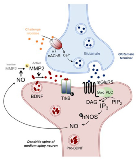 As proposed in Figure 5, challenge exposure to nicotine stimulates α7 nAChRs in the glutamate terminals, increases glutamate release in the CPu, and stimulates mGluR5 located in the GABAergic neurons. Stimulation of mGluR5 linked to Gαq increases the concentration of IP3 via elevation of intracellular Ca2+ mobilization. This results in the increase of nNOS phosphorylation (activation) followed by NO synthesis. Elevated NO concentration in the synapses of GABAergic neurons activates MMP2 from the inactive form, leading to an increase in BDNF synthesis. Elevation of BDNF then stimulates TrkB in GABAergic neurons, which exerts functions on hyper-glutamatergic neurotransmission caused by challenge exposure to nicotine. In conclusion, elevation of NO synthesis after challenge exposure to nicotine activates MMP2, and upregulates BDNF synthesis through mGluR5-linked IP3 pathways in the CPu of rats. This finding may imply the potential role of NO in the upregulation of BDNF under hyper-glutamatergic neurotransmission caused by challenge exposure to nicotine.