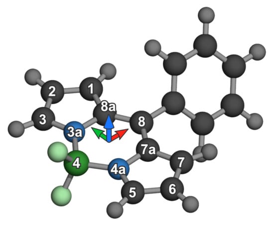 - Wen, J.; Han, B.; Havlas, Z.; Michl, J. An MS-CASPT2 Calculation of the Excited Electronic States of an Axial Difluoroborondipyrromethene (BODIPY) Dimer. J. Chem. Theory Comput. 2018, 14, 4291–4297. [Google Scholar] [CrossRef]