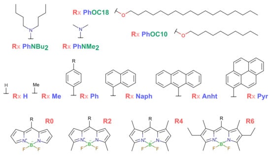 - Marfin, Y.S.; Usoltsev, S.D.; Kazak, A.V.; Vodyanova, O.S.; Novikova, N.E.; Verin, I.A.; Rumyantsev, E.V.; Kholodkov, I.V.; Merkushev, D.A. Supramolecular organization and optical properties of BODIPY derivatives in Langmuir–Schaefer films. New J. Chem. 2020, 44, 19046–19053. [Google Scholar] [CrossRef]