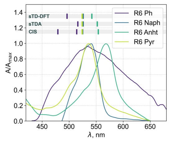 - Grimme, S. A simplified Tamm-Dancoff density functional approach for the electronic excitation spectra of very large molecules. J. Chem. Phys. 2013, 138, 244104. [Google Scholar] [CrossRef]