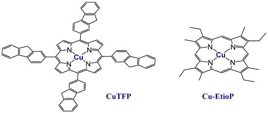 - Chernyadyev, A.Y.; Aleksandrov, A.E. Copper(II) meso-Tetraphenyl- and meso-Tetrafluorenyl Porphyrinates as Charge Carrier Transporting and Electroluminescent Compounds. ACS Omega 2022, 7, 8613–8622. [Google Scholar] [CrossRef] [PubMed]